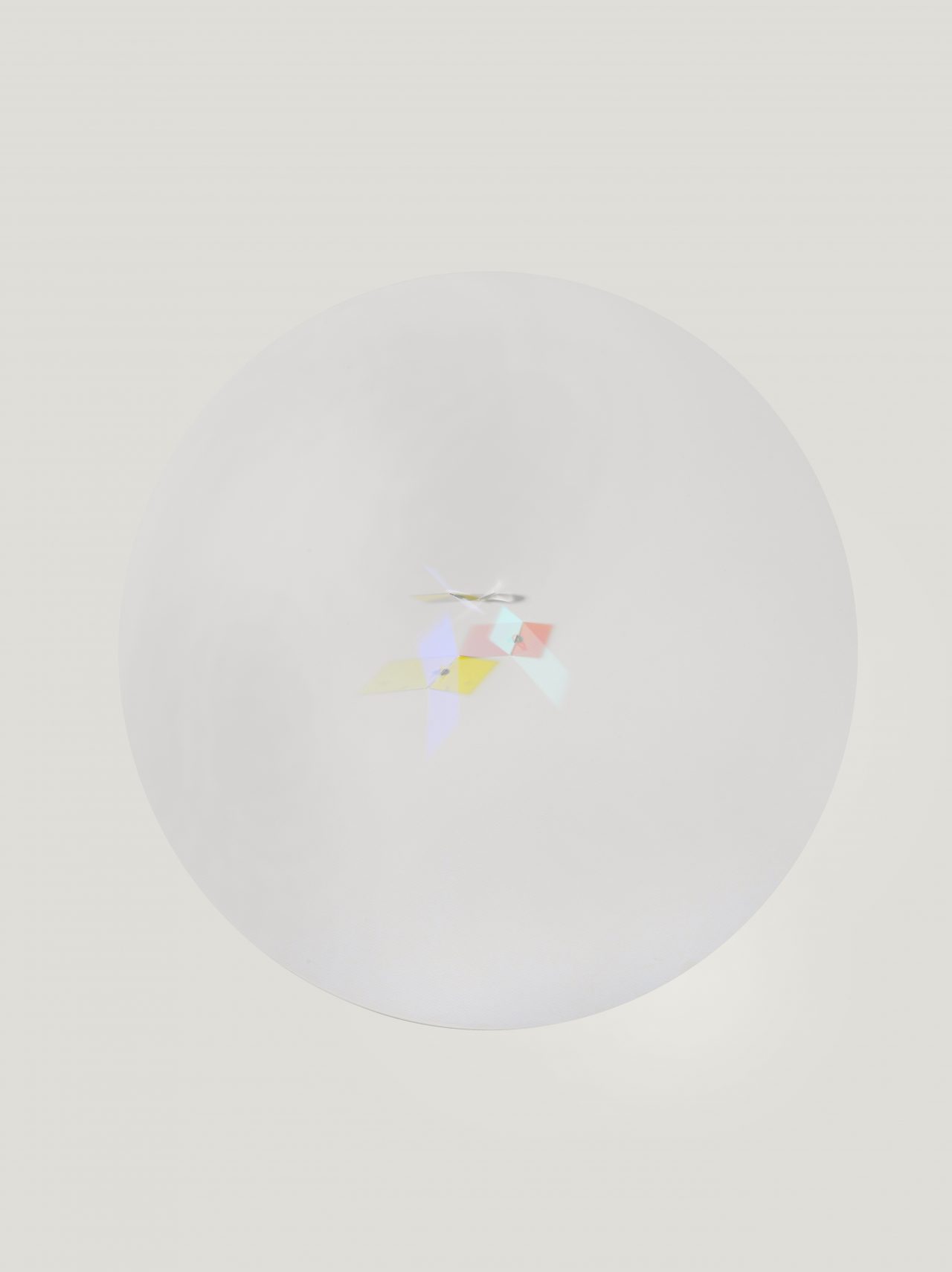 Ross Manning’s work is assembled from an array of everyday materials or objects like fluorescent tubes, ceiling fans, household twine, brown paper, and overhead projectors, brought to move and sound, often in unexpected ways. As Danni Zuvela says about Manning’s work “life enters [his] art literally, in the kinetic animation of objects and dancing beams of light…” Ambient Painting 2017 is created entirely from dancing beams of light. Made from diachroic glass, which is formed using a stack of thin pieces of glass with a micro-layer of silver. This produces what is known as thin-film optics. Depending on the light and angle of view, shifting colours expand across a surface. In a way that suits Manning’s sensibility completely, the colour effect is produced by the interference of different visible light wavelengths, which either enhance or reduce the reflected light. A natural phenomenon it turns out, seen daily with soap bubbles in the bath, or on the street in oil slicks.