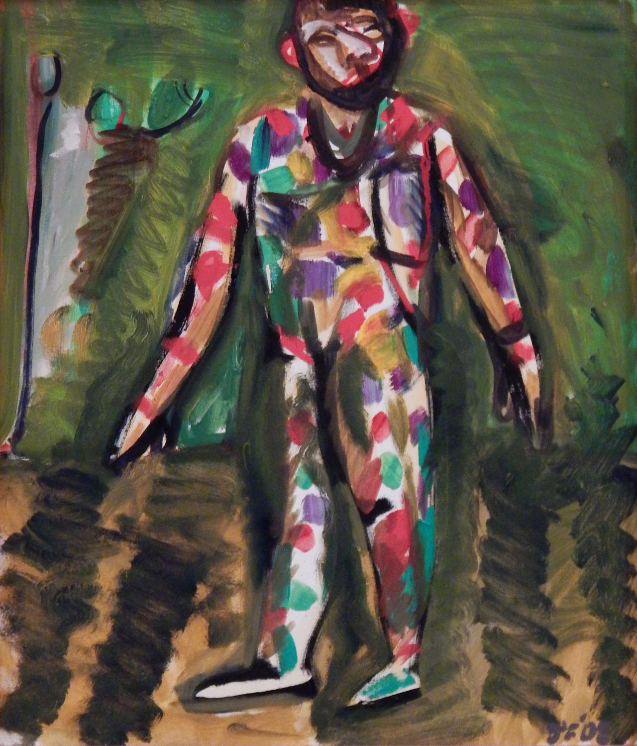 Joe Furlonger is known for his large wide and energetic land and seascapes. He is also known for his large archetypal figures that inhabit and fill to the brim these Australian spaces. In Circus clown 2005 and Circus ring and spotlights 2005, Furlonger explores the energy and thrill of the circus, originally inspired by the winter circus or Cirque d'Hiver in Paris. While in Paris Furlonger would paint and draw through performances attempting to capture the fleeting energy of the performers, and the theatrical spectacular of the space. Circus clown 2005 however seems to give us a glimpse of the dark side of circus life, where the clown is surrounded more by shadows than bright lights. Circus ring and spotlights 2005 gives us such a high angle view of the ring, that we can only see the circus as a child might in amazement.