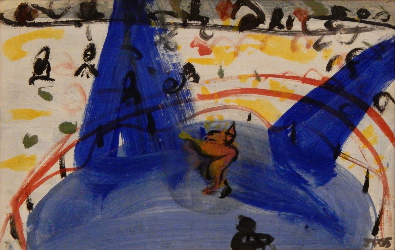 Joe Furlonger is known for his large wide and energetic land and seascapes. He is also known for his large archetypal figures that inhabit and fill to the brim these Australian spaces. In Circus clown 2005 and Circus ring and spotlights 2005, Furlonger explores the energy and thrill of the circus, originally inspired by the winter circus or Cirque d'Hiver in Paris. While in Paris Furlonger would paint and draw through performances attempting to capture the fleeting energy of the performers, and the theatrical spectacular of the space. Circus clown 2005 however seems to give us a glimpse of the dark side of circus life, where the clown is surrounded more by shadows than bright lights. Circus ring and spotlights 2005 gives us such a high angle view of the ring, that we can only see the circus as a child might in amazement.