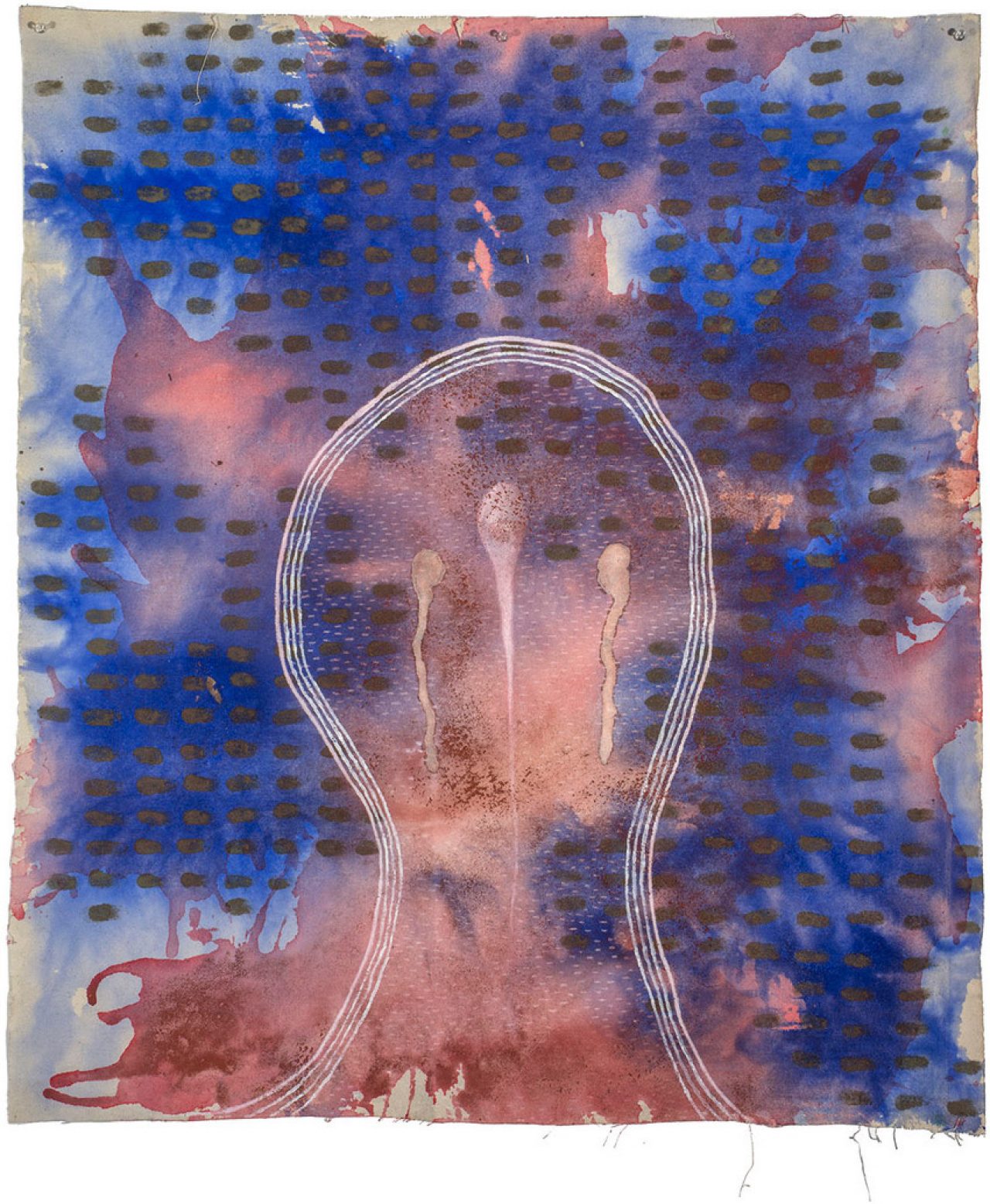 Judy Watson’s in and out of life 1 2016, and in and out of life 2 2016 created from painted island mud, pigment and acrylic on canvas are works that give the sensation of hovering. Though it is not entirely clear whether it is you the viewer who is hovering over the work, or whether it is the work that is hovering over you. Perhaps this perception is created by the thin layers of the pigment, mud and acrylic that themselves seem to hover over the canvas. Watson works with canvases on the floor of her studio, and sitting with them she slowly builds up layers of diluted pigment, which curiously also give the sense of revealing or uncovering what is already there. For in many ways Watson’s work always emerges as a form of mapping. But these maps don’t always reveal a world of matter but follow as she says “lines of emotional and physical topography that centre on particular places and moments in time.” Perhaps it is this quality of time —passed, and passing that triggers the sensation of hovering. They are indeed magical works.