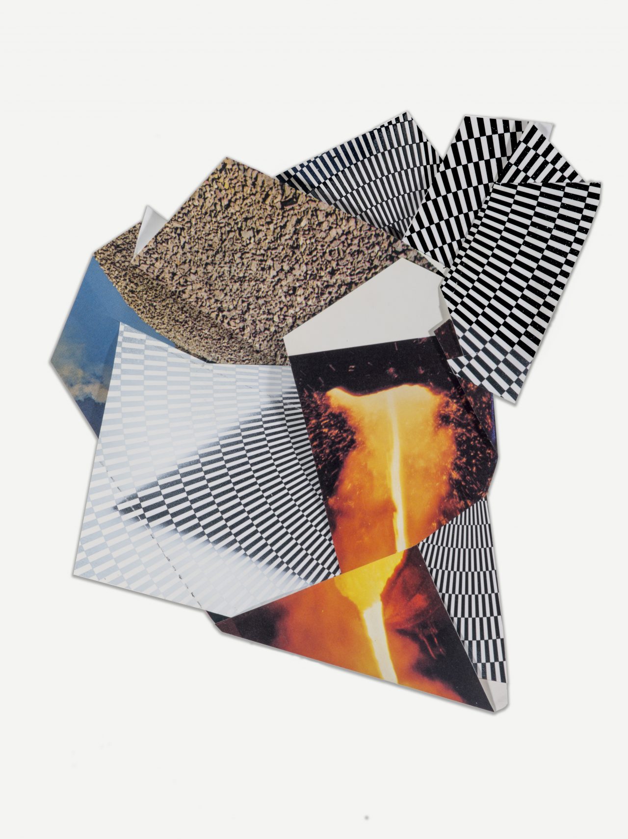 Sandra Selig’s work Interleaves 2014 comes from a suite of small paper collages. But surprisingly they tell big stories. The meaning of the word interleave is to insert blank sheets of paper into a book for notes or written comments. It also has a contemporary use relating to computer media, which is to arrange (an operation) so that two sets of instructions are performed in an alternating fashion. Strangely both meanings seem to have application in this work. The series is composed from pages of photographic images of nature and the universe removed from a journal The Violent Universe. Selig has used an origami-style folding of paper to bring these ‘found images’ together with pages of optically charged graphics. In Interleaves 2014 nature (perhaps a lava flow) is wild, turbulent and uncontrollable, and the accompanying folded paper in its flickers and flashes is also optically uncontrollable. It is a game of association and optical play. In some ways this collaged image could also be like score for music that flows, surges, pulses and flashes too.