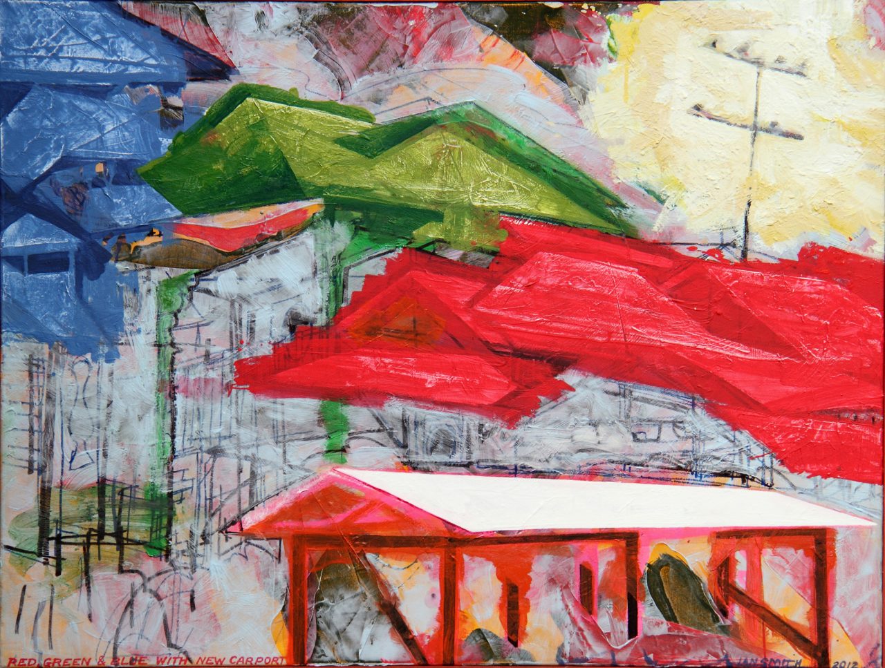Ian Smith tunes into locality as a psychological space. He picks up on the abundance of colour but also the tensions in and between these coloured spaces. In Red, Green & Blue with new carport 2012 Smith has captured the intense upscaling of Brisbane’s suburbs over the last few decades. Suggested architectural plans float in the air as hopes and aspirations. However what is fully formed in this glimpse of a hilly suburb is from another era. It is the raw and seemingly immovable telegraph pole and the matter-of-fact new carport (read shed) prominently installed in the foreground. Perhaps pragmatism wins out.