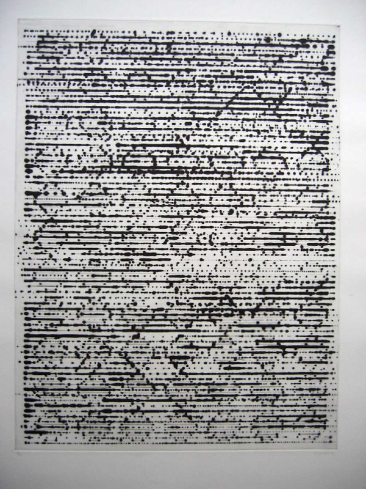 Kim Westcott’s drypoint prints explore the elements of point and line. All her works seem like maps of various kinds. Some works appear to be maps of landscapes in the dry, or swollen rivers in floods, or cityscapes at night, or subterranean creatures’ tunnels. On the other hand, Westcott’s two works in TRACE both Untitled 1 1991 and Untitled 2 1991, seem rather like sound maps, or records of vibrations. We see, and also hear and feel these works through the repetitious compression and expansion of points and lines.